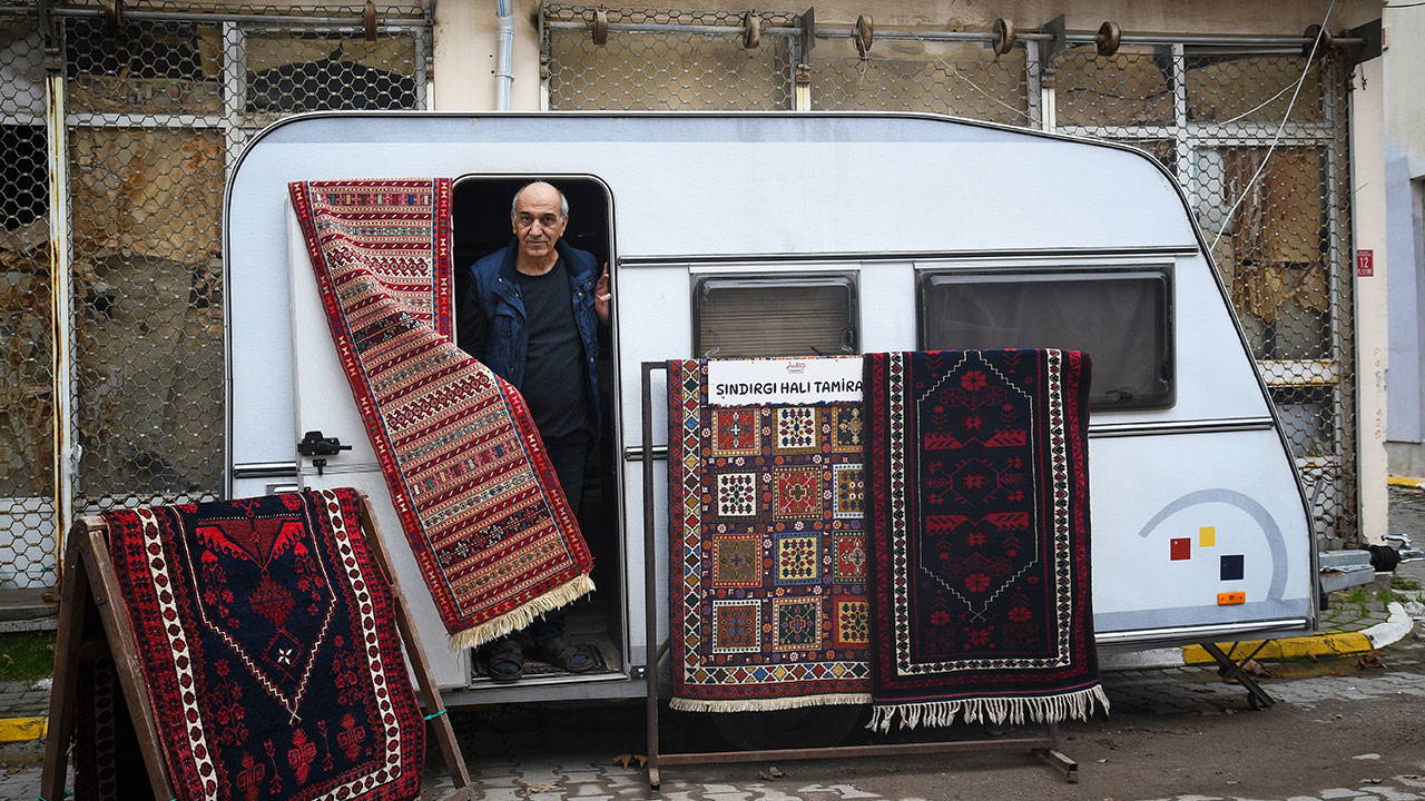 Bunun üzerine satın aldığı bir karavana iş yerini taşıyan Öztürk, yaşamını da sürdürmeye başladığı araçta halı ve kilim tamiratı yapıyor.