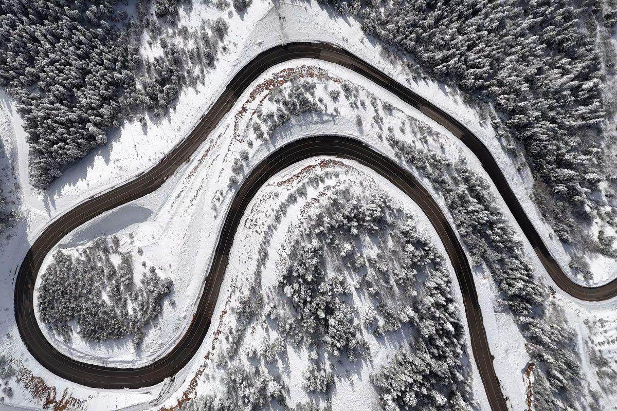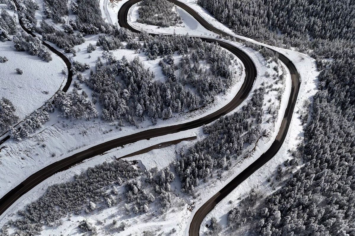 Drone çekimlerine yansıyan görüntülerde, kar altındaki kıvrımlı yolların arasından süzülen araçlar, doğanın gücü karşısındaki mücadeleyi gözler önüne seriyor.
