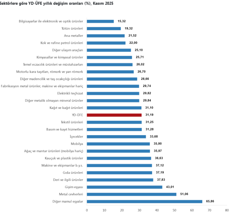 Ana sanayi gruplarına bakıldığında yıllık bazda en yüksek artış dayanıksız tüketim mallarında görüldü. Bu grupta fiyatlar yüzde 38,38 artarken, dayanıklı tüketim mallarında yüzde 36,70, ara mallarında yüzde 28,24, sermaye mallarında yüzde 29,75 ve enerjide yüzde 22,00 artış kaydedildi.